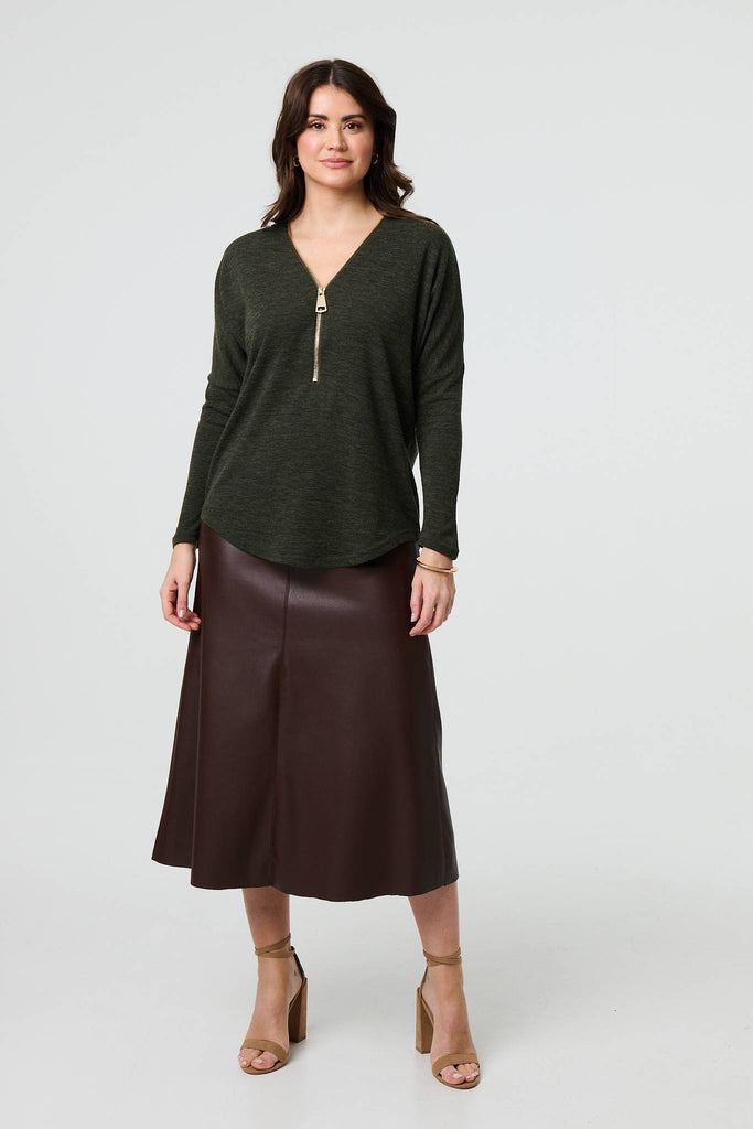 Zip Front V-Neck Relaxed 3/4 Sleeve Top
