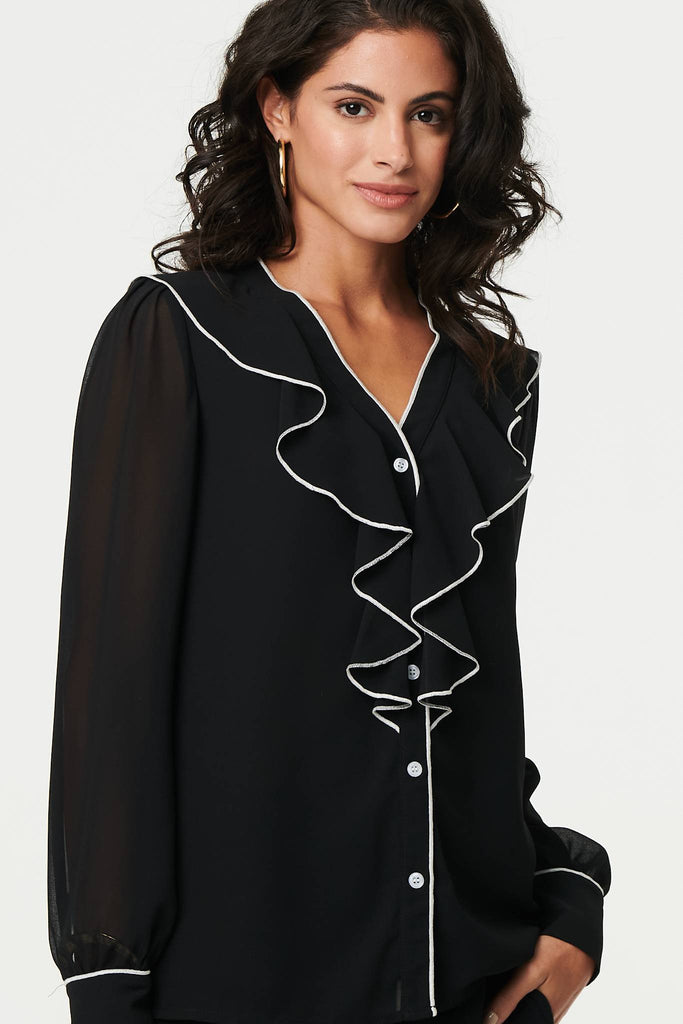 Contrast Trim Semi Sheer Ruffled Blouse