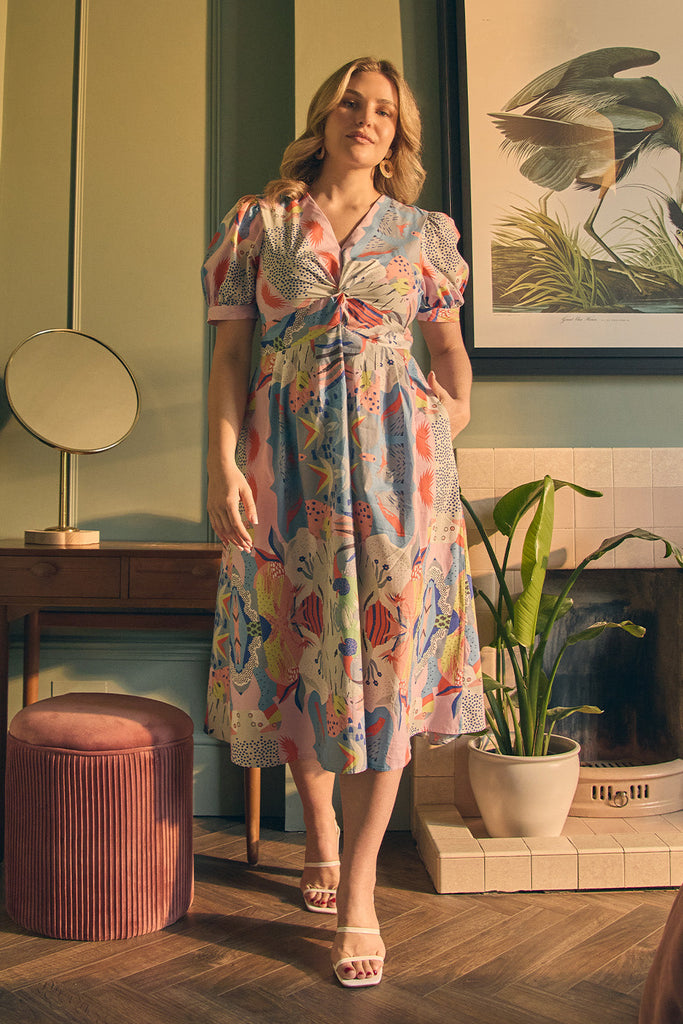 Abstract Tie Neck Puff Sleeve Midi Dress